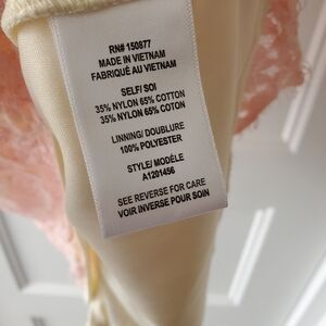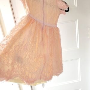 This embroidered dress was worn once for a birthday. It is peach pink with a lace-like material and lining underneath. It has a full zipper at the back. The materials are cotton, nylon, and polyester.