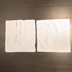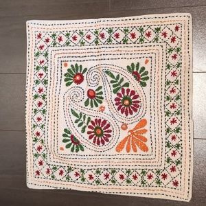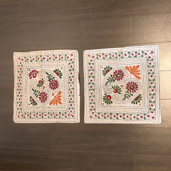 Two hand stitched embroidered pillowcases. Paisley flower pattern on natural fibre squares.