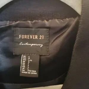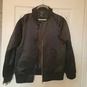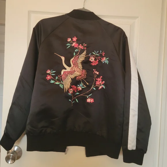 Black with white stripe down the arms. Embroidered crane on the back. Polyester silky texture. From Forever 21. Good used condition