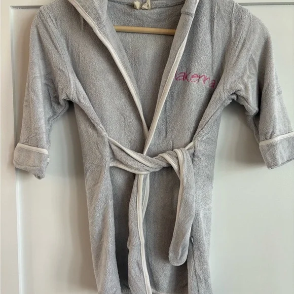 Cozy gray bathrobe with a hood. Features pink embroidery on the chest. Perfect for lounging.