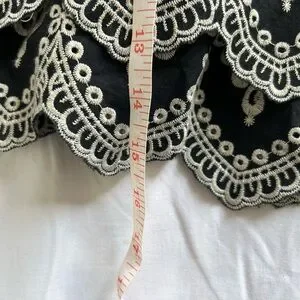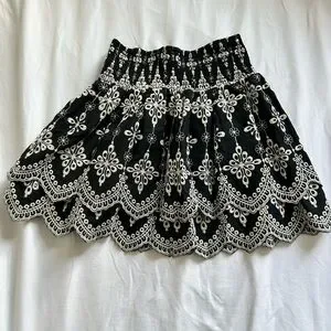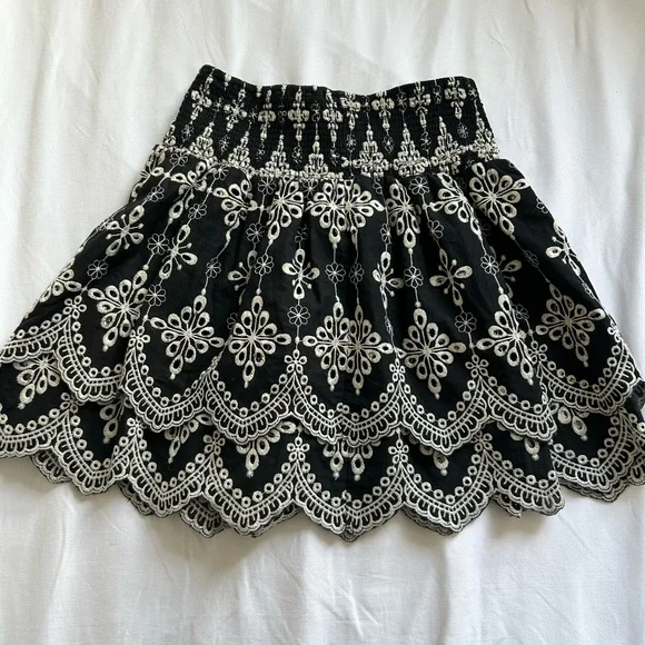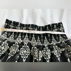Embroidered, ruffle, tiered mini skirt Size M, very stretchy and could fit sizes XS-M Waist stretches up to 14inches Waist and length measurements shown