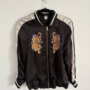 Stylish black jacket featuring vibrant tiger embroidery. Perfect for adding a bold touch to any outfit.