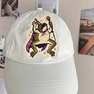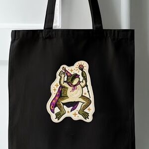 Unique embroidered patch featuring a toad wizard. Vibrant purple and gold details.