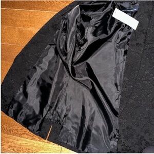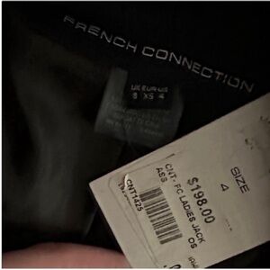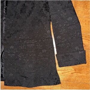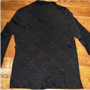Black womens vintage French connection tuxedo style blazer suit jacket. Floral embroidered pattern. Cuffed sleeves. Padded shoulders. Two pockets. Slits on the sides. Thread loops on the sides to add a belt. No closure. Oversized fit.