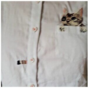Small Pocket at chest - embroidered cat on top of pockets with paws on pocket. Tail at buttons