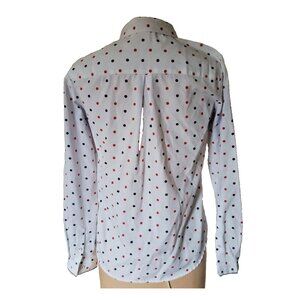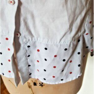White with polka dots (on collar, back, sleeves, bottom front) in red and black