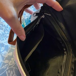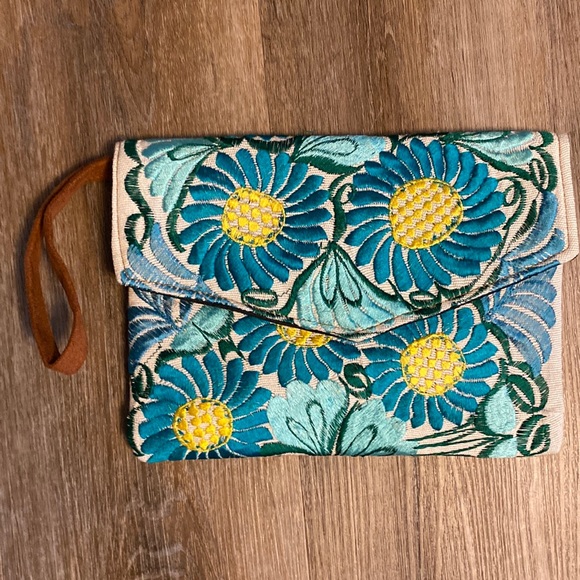 Bought in Mexico, never used, interior with dual pockets and zippered closure, strap is faux suede. Measures 10 x 7 1/2”. Perfect condition!