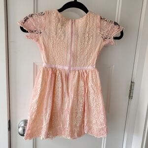 Used once for a birthday and outgrew very quick. Kinda lace materials with lining underneath. May have snugs but not noticeable. No stains or tear. Full zipper at the back. Materials are cotton, nylon and poly.