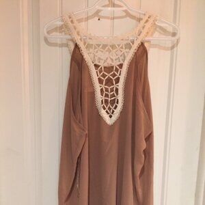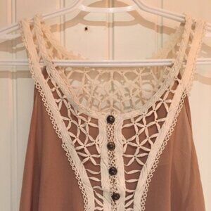 Flared top, with embroidered lace garnment. Brand : Zenobia. Fabric : 100% polyester. Color : Tan and white. Size : 2XL.