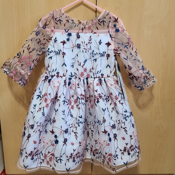 Keep baby cute at their next big event in this embroidered dress framed by sweet three-quarter tulle sleeves and a flared skirt.