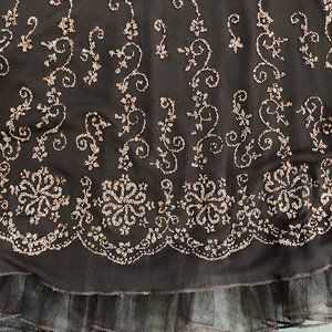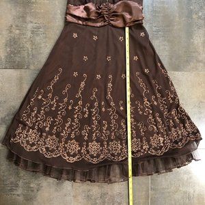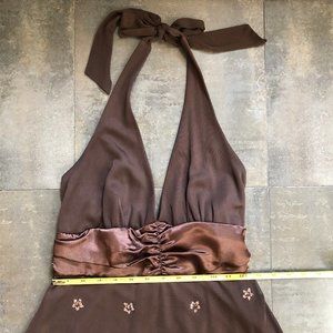 Cute, brown halter neck cocktail dress with flared, skirt embroidered with tiny beads in a sweet flowery pattern.