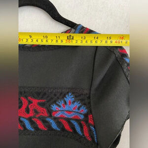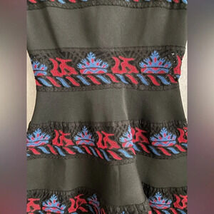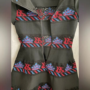 This dress is great to wear for dances, formal events/ cocktail parties. Super thick stretchy fabric with mesh backing at the hem for structure. The embroidered strips are semi transparent lace. A- line structure dress.