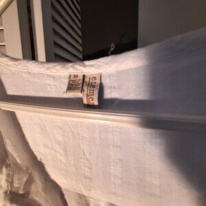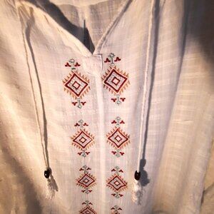 Peasant blouse, rayon, embroidered with tassel ties, elasticized cuffs. Tiny bit of pilling at sides and under arms.