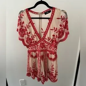 Nude and red embroidered romper
