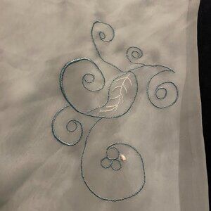 Blue and white embroidered flowers along the neckline