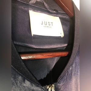 Navy Blue spring jacket with white floral embroidery detailing on the back. 100% viscose, a very smooth feel!