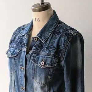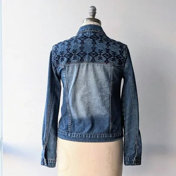 Dark Denim Jacket with a Tribal, Midwestern navy embroidery across the yolk & upper front. Unbranded, 100% Cotton. This is from my personal collection and to be honest I still really love it, it's just a matter of being ready for something new. Also very cute open with rolled up sleeves. Relaxed Fit