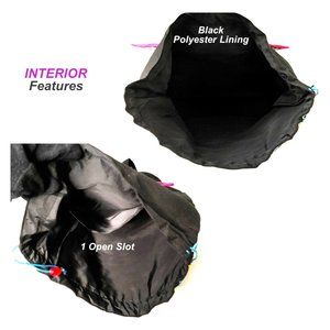 Made of canvas (cotton polyester) material, black lining is polyester, high quality and durable. Closure type: Magnetic, Drawstring with button.