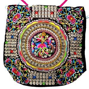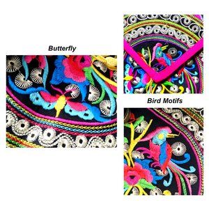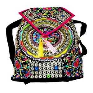 Durable canvas black backpack shoulder bag, large size. Exquisite and unique ethnic Boho style embroidered designs with flowers, birds, butterflies, Geometric shapes with multicolours pink red purple green blue with adjustable shoulder strap shoulder bag. Stunning diamond shape top cover with red trimmed, accents yellow and pink tassels. A zip pocket on the backside for valuable item.