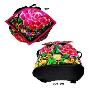 Durable canvas black backpack womens ladies girls shoulder bag, large size. Exquisite and unique ethnic style embroidered designs with beautiful peony flowers floral, birds, butterflies in multicolours black, pink red purple beige green brown with adjustable shoulder strap shoulder bag. Stunning diamond shape top cover with red trimmed. Accents pink and green tassels. A zip pocket on the backside for valuable item.