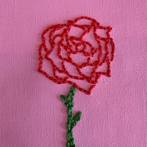 Hand made rose embroidered canvas art work. Dimensions are 5” x 7”. Perfect as a gift or for a little girls’ room or nursery!