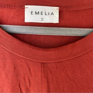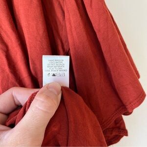 Cozy meets stylish in this oversized Emelia short sleeve top, size small. Features a soft rayon modal blend in a rich rust red color, flutter sleeves, and a front tie hem for that laid-back, casual chic look. Drop-shoulder fit with lots of room—perfect for relaxed everyday wear or dressing up with denim and sandals.