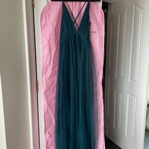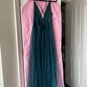 You'll shine like the sun in this beautiful maxi dress! The long ethereal tulle skirt will gently rock with each step you take, while the plunging neckline and the open back are sure to turn heads. Features an invisible zipper and adjustable straps. Thanks to the stretch lining with its two lateral slits, you can dance the night away with ease!
