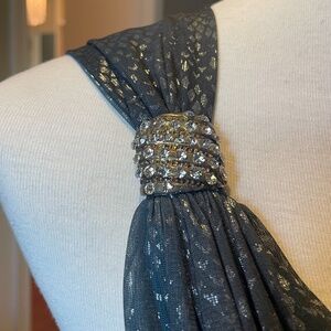 Stunning A-line floor length dress features a sleeveless deep v-neckline.