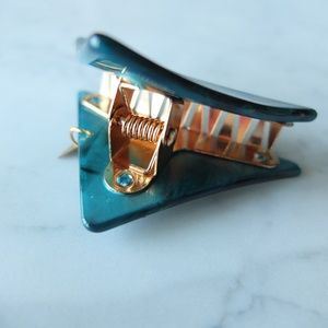 Emerald green acrylic hair claw with a goldtone accent. Hair claw is in rose gold. Simple and elegant! Holds hair securely with metal alligator clips.This is a very elegant timeless colour & design. You can dress it in a flipper 1920s (Art Deco) or make it current.