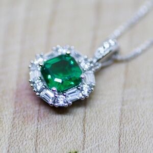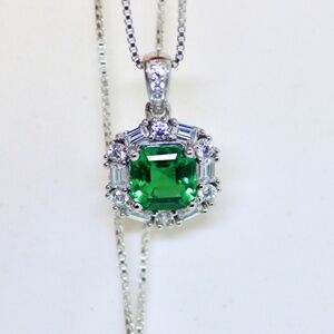 This ethereal pendant features a vivid 7mm lab-made emerald (approx. 2 carats) surrounded by brilliant clear lab-created sapphires. Every movement catches the light, making this a captivating and elegant piece for any occasion. ๐