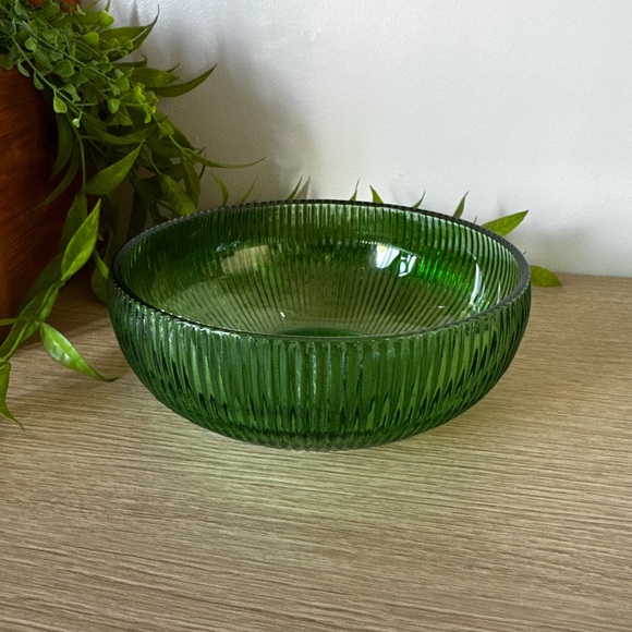Stunning emerald ribbed glass bowl. Ideal for decor or serving. 2.75” tall x 6.25” round