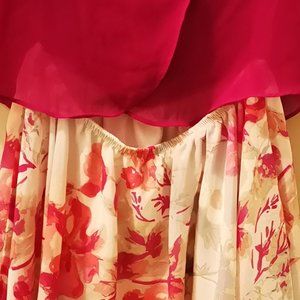 A very pretty, floaty dress with a key-hole design open back, which is usually covered by the floaty top material. The top part is fitted but is made of floaty material that lies overtop of the fitted part. Very fairy-like. Size small. Fits me well, and I am roughly a size 4 to 6 (US size).