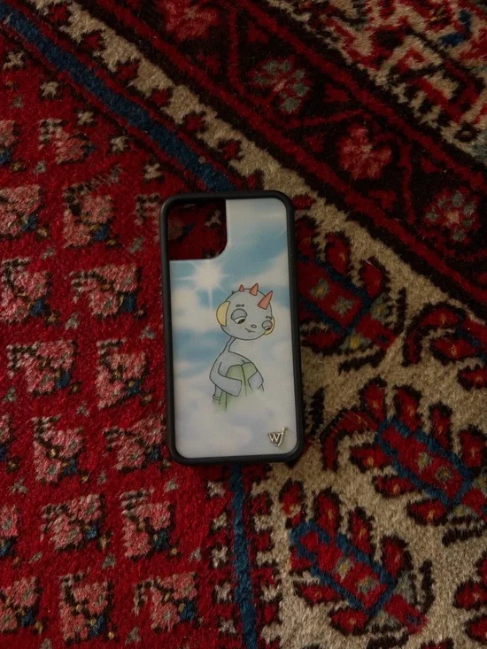 Playful cartoon character printed on a soft blue gradient backdrop. Protective black bumper frames the design. Lightweight and easy to grip. Subtle Wildflowers logo at the corner.