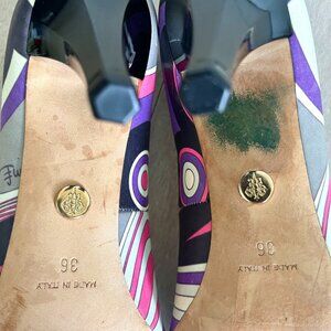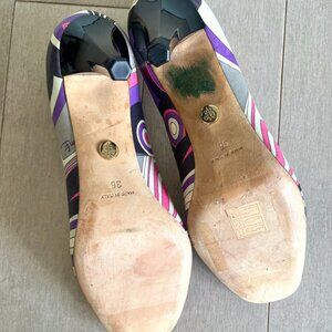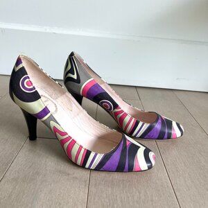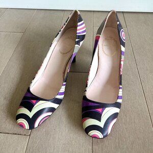 ⋆ Multi-coloured spiral / stripe design close-toe high heels by Emilio Pucci. Featuring multiple different colors such as: black, bubblegum pink, a teal shade of gray & bright purple (please rely on photos). Chic & timeless.