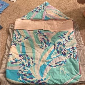 Soft and cozy floral hooded baby sleeping bag in cream and blue. Perfect for keeping your little one warm and comfortable.