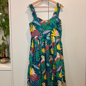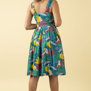 - Features: Button-up, fitted bodice, sweetheart neckline, gathered straps, a-line skirt