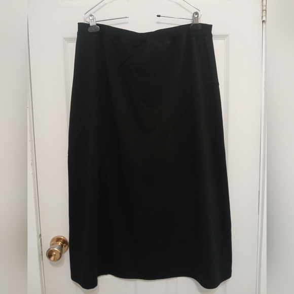 Classic black long pull on skirt from Emma James. Material sewn in diagonal pieces, giving interesting detail to the skirt. Elastised waist for comfort. In very good pre-owned condition. Size XL.