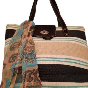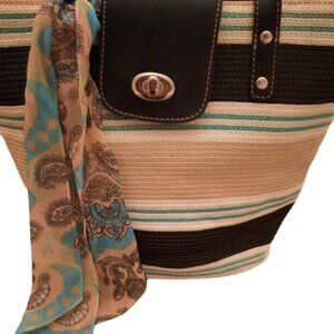 Emma James for Liz Claiborne woven beige/blue/cream handbag w scarf attd