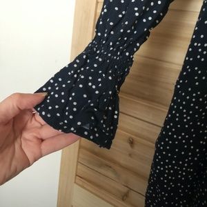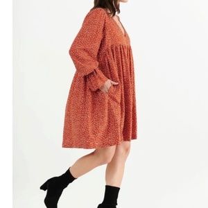 Deep pockets, v-neck, elastic cuff long sleeve, empire waist and billowy skirt makes this dress really comfy and sweet. It has a nice swing when you walk.