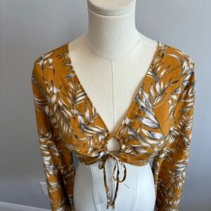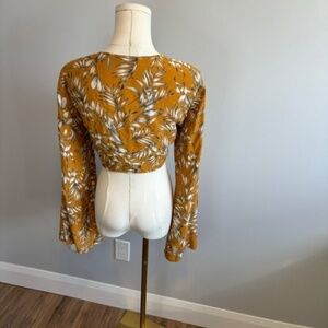 Emory Park, Women's Mustard Long Flared Sleeve Crop Top, Leaf Print SZ L