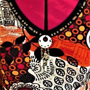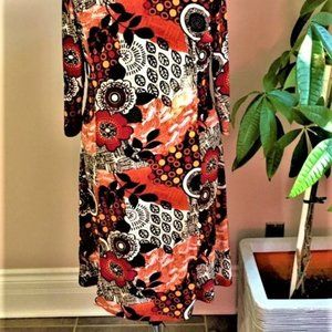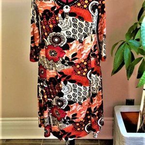 Emotions floraland abstract print princess dress, V neckline with decorative beads and 3/4 length sleeves with pleat and beads. The vibrant colors of the dress are black, orange, red and white. Its length is mid way below the knee and the ankle. The fabric consists of 95% polyester and 5% spandex.