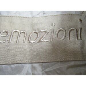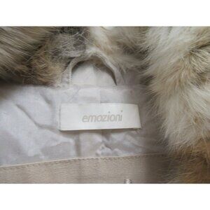 Emozioni womens trench coat or overcoat, new with tags. This is an Italian brand. The coat is very high quality with a real fur collar that is removable (I don't know the type of fur, maybe rabbit). The pockets also button on and off if you want to. Gorgeous coat with a sash to tie it tight if you wish. I am not sure what material the coat and lining are made of but this is a heavy coat good for colder days. It has some filling to make it thick and warm.