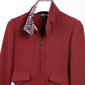 Introducing the Emporio Armani 2010 Maroon Wool-Blend Jacket with Paisley Trim. This striking moto-inspired jacket features a stand collar with a hidden hood for versatility, and princess seams for style. The wool-blend, front dual zipper closure, silk lining, and two distinct pockets add convenience, making it the perfect transitional piece.