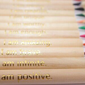 This 12-piece affirmation pencil crayon set features empowering messages like “I am strong,” “I am worthy,” and “I am enough.”