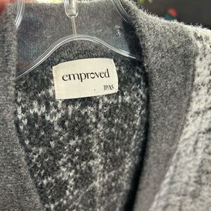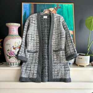 This gray cardigan features a stylish checkered pattern with darker gray lines, offering a chic two-tone look. The open-front design make it perfect for layering over your favorite outfits. Its medium length provides a flattering fit that falls around the hip level.