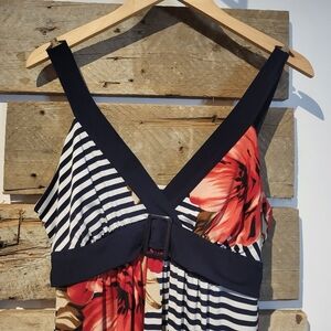 Elegant maxi dress featuring bold floral patterns and classic stripes. Perfect for any occasion.