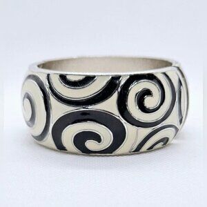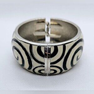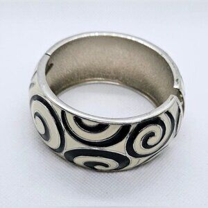 Enamel Black & Cream Swirl Design Silver Tone Hinge Cuff Bracelet