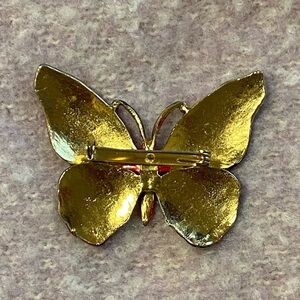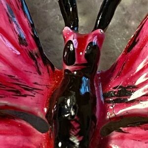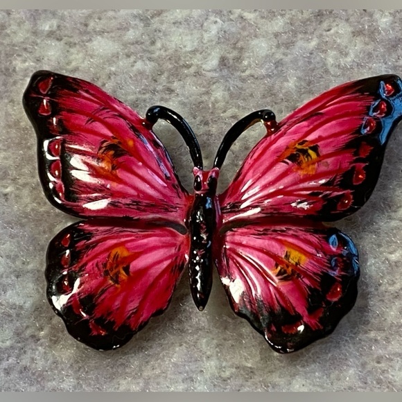 Pink and black high gloss enamel on gold toned metal. Check out the photo above - she even has a cute little face!