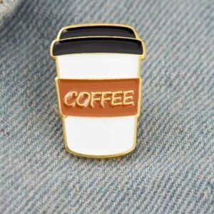 New in pack, very unique piece and a reminder for hot coffee, style to unique style preference, can be styled on bags , jackets and on dresses, material zinc alloy, measurement dimension length 0.9'', width 0.6''