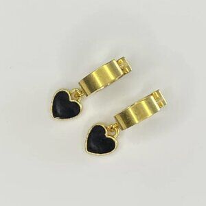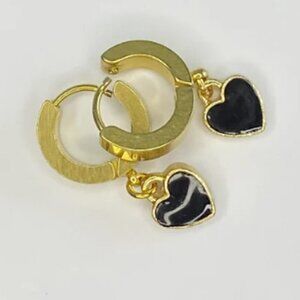 Enamel in black is centered in metal alloy hearts hung on stainless steel huggie hoop earrings. Small and understated, but full of heart.
